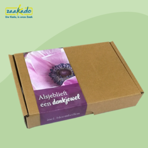 Zo’n bloemen brievenbuspakket wordt extra gewaardeerd als u het brievenbuspakket laat bedrukken met uw persoonlijke boodschap, in de huisstijl van uw organisatie! Dan ziet de ontvanger direct bij ontvangst wie het cadeau geeft en waarom. Dit kan heel eenvoudig. ZaaKado maakt een banderol of sleeve in uw huisstijl en bevestigt deze om de kraftdoos. De sleeves kunnen op verschillende formaten worden gedrukt, in full colour.