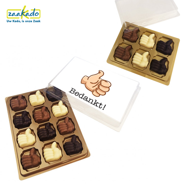 Topkwaliteit Belgische chocolade in de vorm van een opsteker, namelijk een duim omhoog. Daar wil je wel je tanden in zetten! Dit chocolade bedankje is leverbaar als melkchocolade duim, maar ook in puur en wit. Kiest u voor 6 duimen omhoog in een blister verpakking? Of wordt het toch die heerlijk grote 12 stuks blisterverpakking? Met uw eigen bedrukking uiteraard op het deksel. Zodat de afzender duidelijk zichtbaar is. En ook waarom de ontvanger zo’n topper is, kunt u hierop kwijt. Als dat niet in de smaak valt? Dit chocoladegeschenk kan ook als brievenbuspakket worden opgestuurd. Leuk voor thuiswerkers!