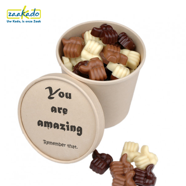 Een origineel bedankje, dat is een duim omhoog, van chocola! Of nog beter, heel veel chocolade duimpjes. Want deze heerlijke luxe zoetigheid maakt precies duidelijk wat je van je collega’s, klanten, leerlingen, studenten of vrijwilligers vindt: Toppers! ZaaKado levert de massieve chocolade duimpjes in puur, wit en melkchocolade. En ook de verpakkingen kunt u zelf kiezen. Een blisterverpakking met 6 of 12 duimen omhoog? Of een XL kartonnen beker met een bedrukt deksel voor nog meer chocolade bonbons? Wij personaliseren alle verpakkingen, met uw logo, boodschap en/of tekst. Zodat u de perfecte inhaker of het ultieme bedankje van chocolade voor elke doelgroep heeft. Lekkerrrr!