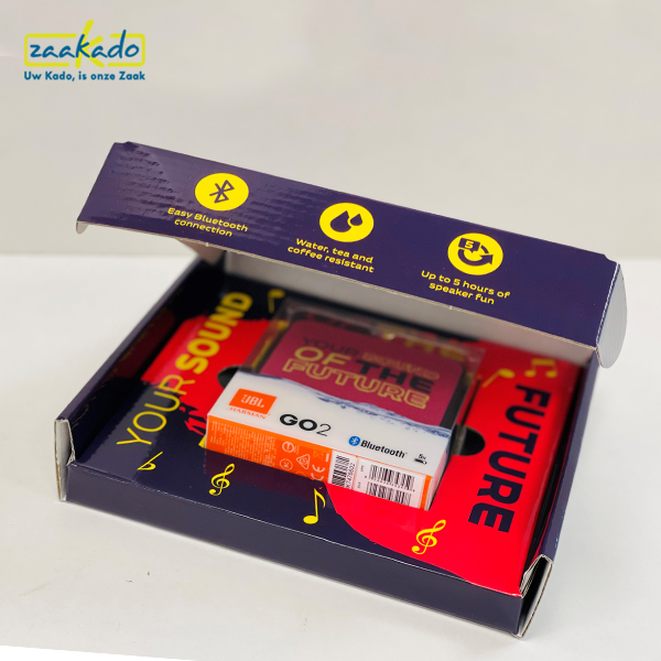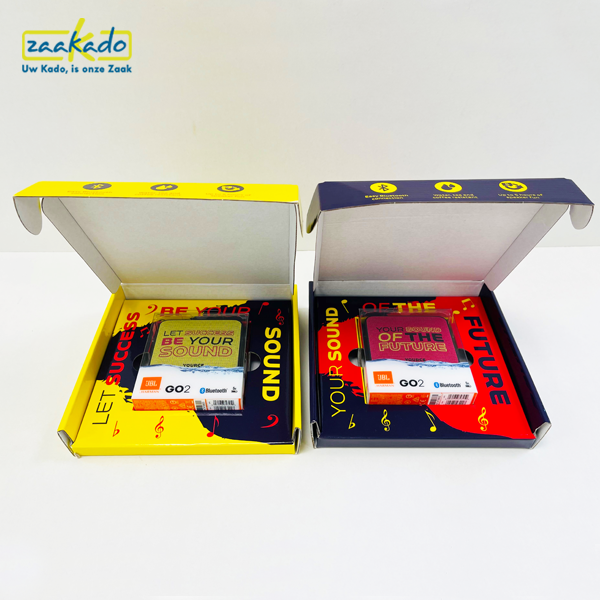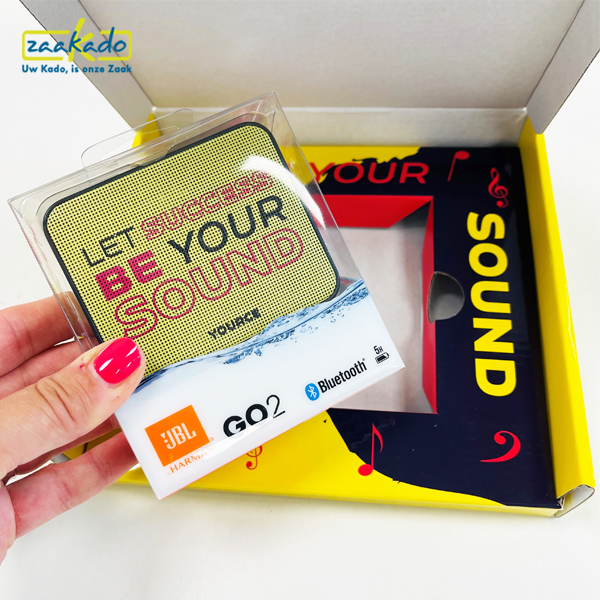 Een muziekcadeau in de look & feel van uw organisatie? Dat kan met deze compacte JBL speaker. Wij verpakken deze muziekbox voor u in een gepersonaliseerde doos. Dus volledig (‘all-over’) in uw eigen huisstijl en ontwerp gedrukt. De JBL speaker is een gewild relatiegeschenk voor elke doelgroep. Maar een compleet gepersonaliseerd JBL pakket zorgt zeker voor de ‘Wow’-factor. Want daarmee creëert u een echt cadeau! Bijvoorbeeld als bedankje voor thuiswerkers, voor relaties en goede klanten, voor vrijwilligers. Maar ook voor de feestdagen, in een kerstpakket of als hip eindejaarsgeschenk. Zo’n luidspreker blijft nog jarenlang een functionele gadget. Een gadget waar muziek in zit!
