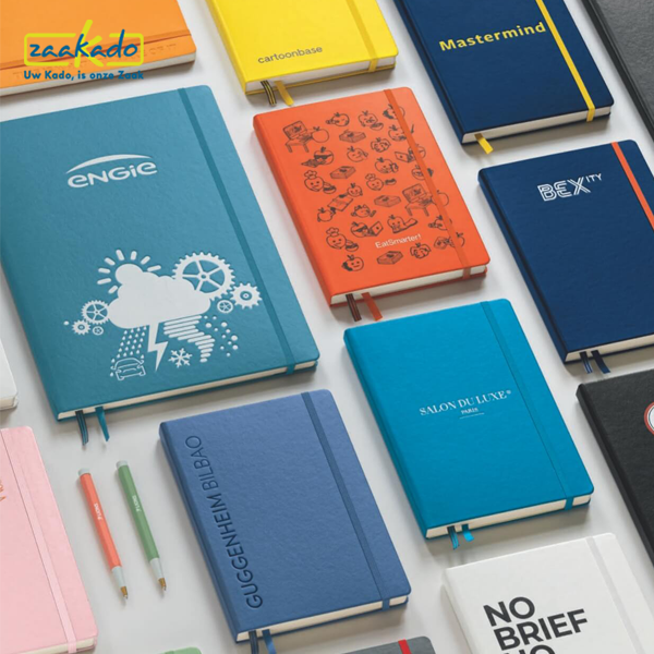 Naast het kiezen van uw favoriete formaat notitieboek en de samenstelling van het papier, kunt u ook promotionele pagina’s in het boekje opnemen. Daarmee creëert u extra ruimte om uw merk of organisatie onder de aandacht te brengen. In full colour uiteraard. Met mooi beeld en een vormgeving in uw huisstijl geeft u hiermee nog meer signatuur aan het notitieboekje. Verder kiest u natuurlijk een bijpassende kleur elastiek (sluitband) en bookmarks. Heeft u uw gepersonaliseerde notitieboek helemaal voor ogen? Dan kunnen wij ook nog een bijpassende banderol of sleeve voor uw maken. In de meest uiteenlopende vormen. Daarmee maakt u dit relatiegeschenk helemaal af. Klaar om uw goede indruk aan uw klanten of medewerkers te geven.