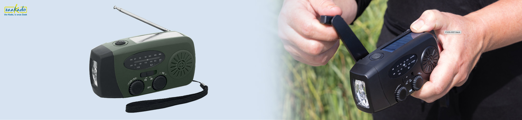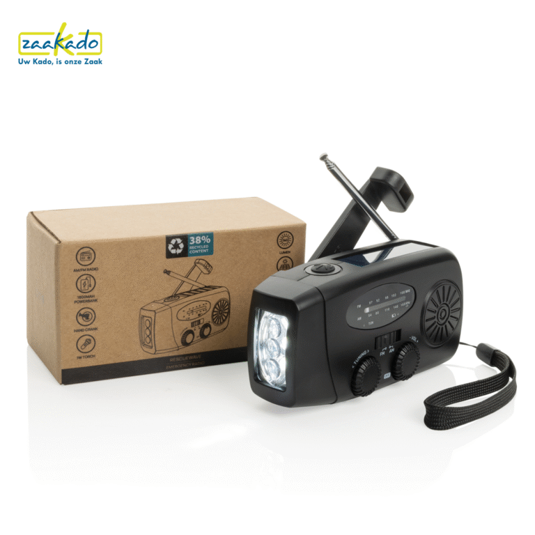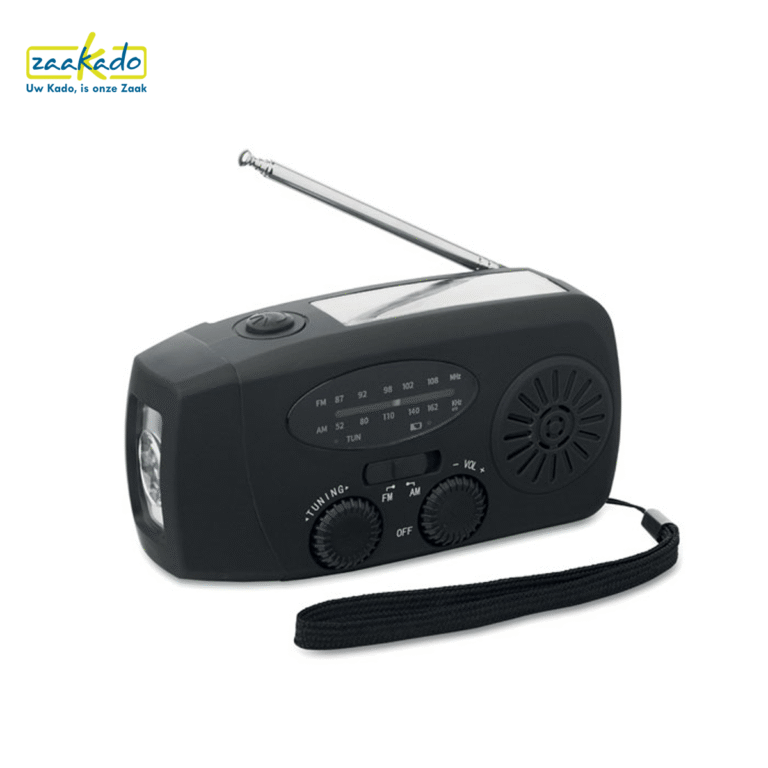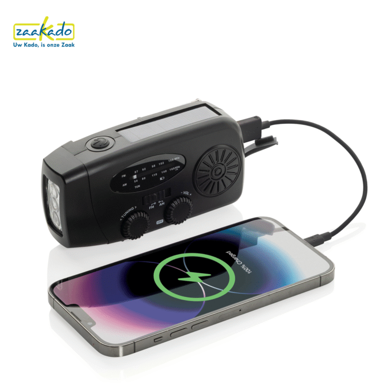 De combinatie van multifunctionaliteit en (maatschappelijke en symbolische) betekenis maakt een noodradio tot een uniek en origineel relatiegeschenk. Het past perfect binnen het thema veiligheid en sluit aan bij een maatschappelijk betrokken imago. Bovendien is het een duurzaam promotieartikel; veel modellen zijn gemaakt van gerecycled plastic of voorzien van zonnecellen, waardoor ze milieubewust én innovatief zijn. En last but not least: ZaaKado zorgt ervoor dat elk detail klopt. Van het ontwerp en de bedrukking tot het verzenden naar klanten of medewerkers. Wij kunnen zelfs de verzending huis aan huis verzorgen, volledig AVG-proof. Je levert alleen de NAW-gegevens aan, wij doen de rest. Dat spaart tijd!